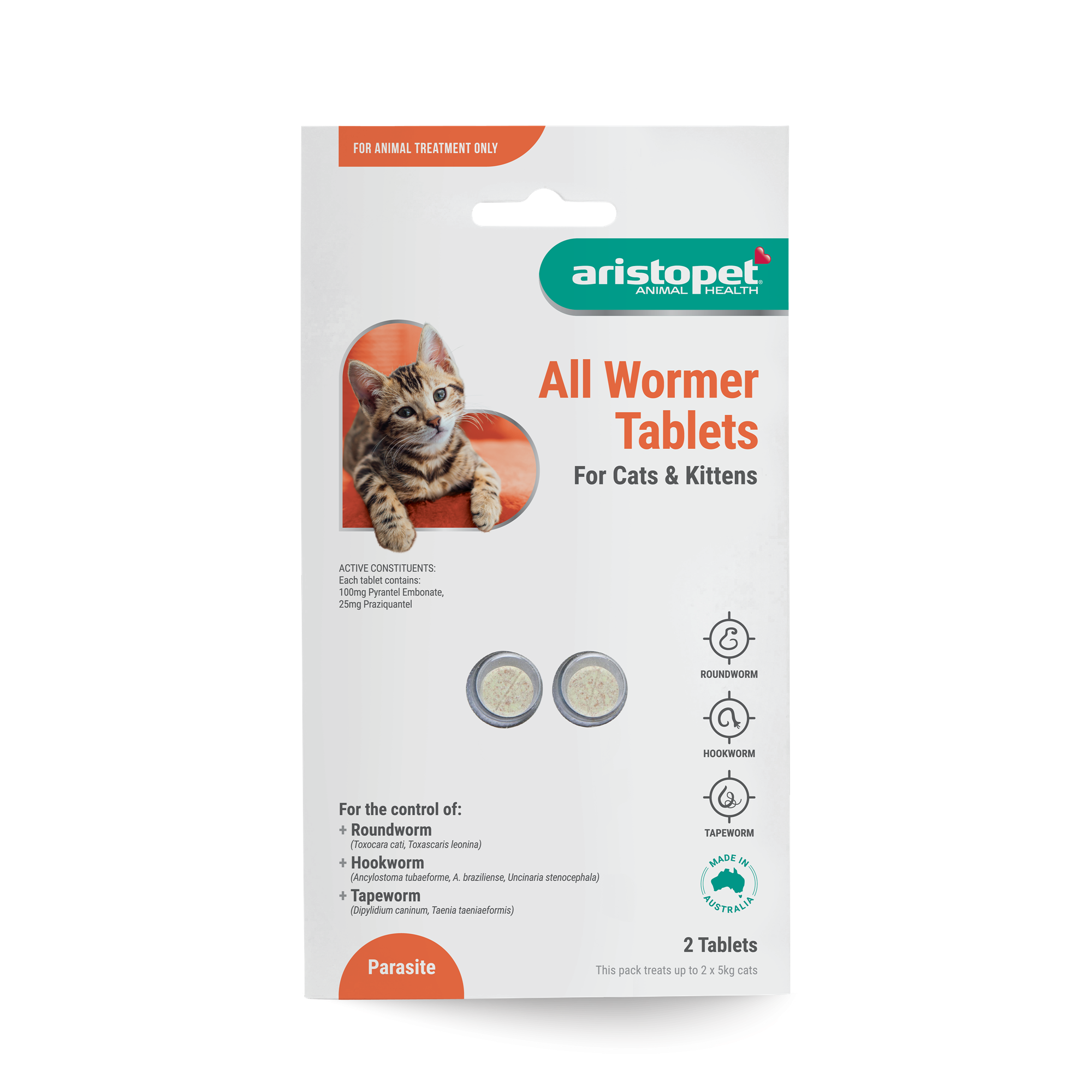 Aristopet All Wormer for cats and kittens provides effective control of Roundworms (Toxocara cati, Toxascaris leonina), Hookworms (Ancylostoma tubaefome, Ancylostoma braziliense, Uncinaria stenocephala) and Tapeworms (Dipylidium caninum, Taenia taeniaeformis).